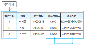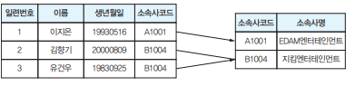 - 일반 속성인 소속사명이 다른 일반 속성인 소속사 코드에 종속 -> 3차 정규화