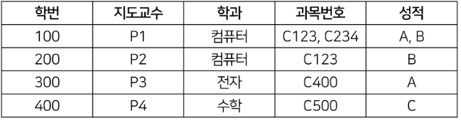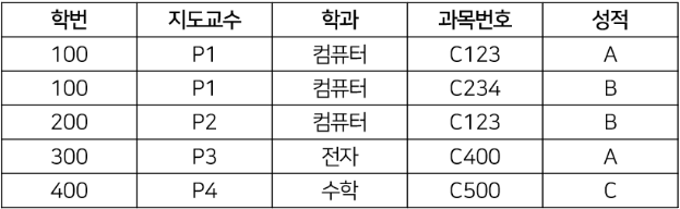 - 학번, 과목번호가 기본키이고, 지도교수와 학과가 부분 함수 종속되어 있다.