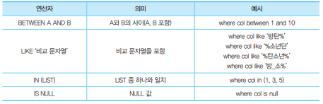 - ex) LIKE 'M%S' -> M으로 시작하고 S로 끝나는 행을 조회