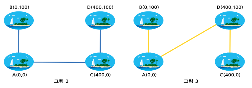 - 총 환경 부담금을 최소로 하기 위해서 하나의 섬에서 다른 섬으로 선분을 연결할 때마다 매번 가장 가까운 섬과 연결해야 한다.